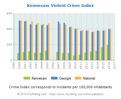 The statistics for Kennesaw are here: note particularly the graph which shows Kennesaw's Violent Crime rate as approx 20% of the median for the state of Georgia.